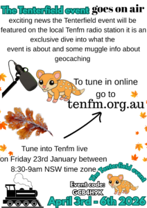 Exciting news the Tenterfield event will be featured on the local Tenfm radio station on Friday 23rd January between 8:30-9 NSW time zone. including an exclusive dive into what the event and geocaching is all about there is a website you can go to if you are from out of town. go to https://tenfm.org.au/